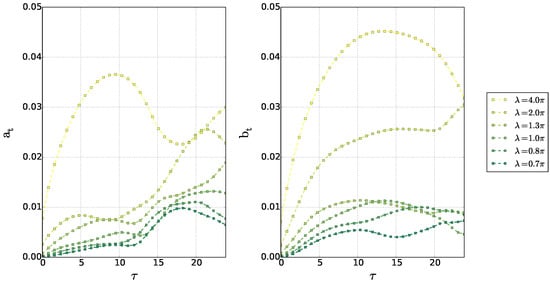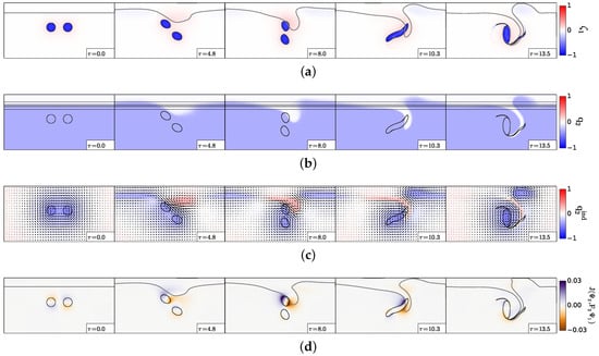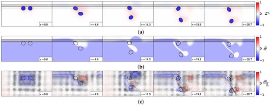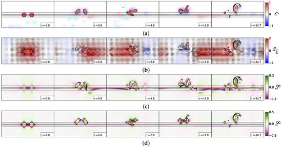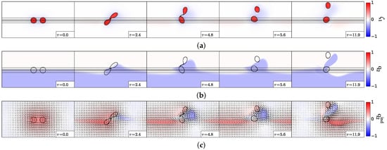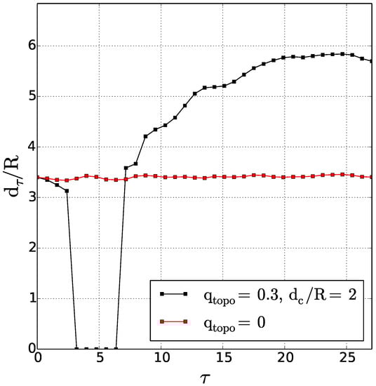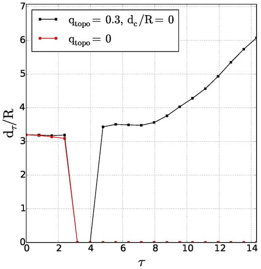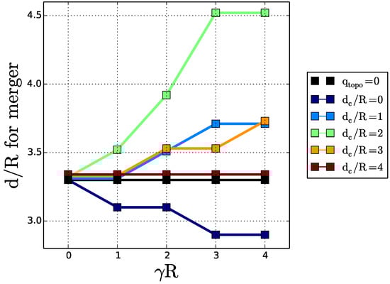 The left-hand panel in Figure 3a is similar to the results obtained by Polvani (1989) [33], for vortex merger over a flat bottom in a two-layer quasi-geostrophic model: in this case, merger occurs for . The invariance of the nondimensional critical merger distance with respect to stratification in this study is related to the vortex initialisation as a disk of constant potential vorticity. When vortices are initially disks of uniform relative vorticity, the critical merger distance depends on stratification via hetonic effects [18,19,34,35,36,37]. Indeed, relative vorticity in one layer induces interface deviation between layers and thus potential vorticity of opposite sign in the other layer. This in turn can lead to vertical coupling of these vorticity poles and to their self-advection, counter-acting the merging process.