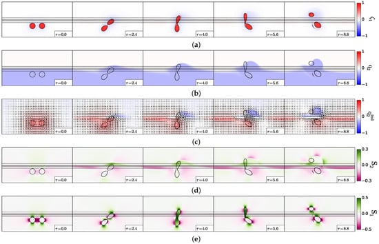 Partial merger of two cyclones, case . (a) Upper layer relative vorticity (Equation (3)); (b) lower layer potential vorticity (Equation (2)); (c) lower layer “equivalent barotropic” potential vorticity and velocity field (Equations (4) and (11)); (d) lower layer velocity shear (Equation (5)); (e) upper layer velocity shear (Equation (5)). In (a,b,d,e), the black contours indicate the topographic slope (Equation (12); straight lines) and the upper layer vorticity contours showing the two vortex evolution. In each plot, x varies between and , and y varies between 0 and .