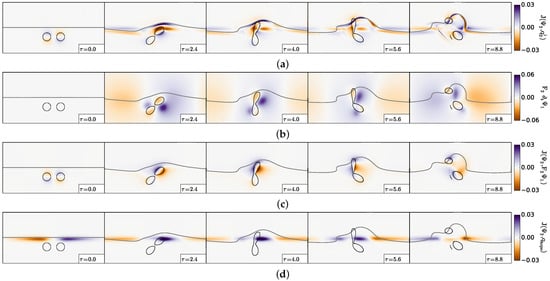 Partial merger of two cyclones, case . Analysis of the terms contributing to the rate of change of the lower layer “equivalent barotropic” potential vorticity (Equation (13)): (a) lower layer advection of this potential vorticity; (b) rate of change of the upper layer flow (via layer coupling); (c) baroclinic advection of the barotropic flow (with layer coupling coefficient); (d) interaction of the lower layer flow with the topography. In all sub-plots, the black contours indicate the front of lower layer potential vorticity anomaly (straight line at ) and the upper layer vorticity contours showing the two-cyclone evolution.