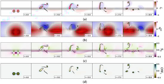 Merger and splitting of two cyclones, case . (a) Upper layer relative vorticity (Equation (2)); (b) lower layer “equivalent barotropic” potential vorticity (Equation (11)); (c) lower layer velocity shear (Equation (5)); (d) upper layer Okubo–Weiss quantity (Equation (7)). The black contours indicate the topographic slope (Equation (12); straight lines) and the upper layer vorticity contours showing the two vortex evolution.
