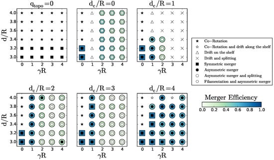 - Asymmetric merger and splitting: The vortex resulting from merger is elongated and subject to intense shear from its cyclonic partner and from topographic vortices (topographic vortices are formed by the amplification, steepening and breaking of topographic waves); this merged vortex splits into two parts. This evolution can occur when is large enough to couple the motions vertically. In this case, the merger efficiency is very small.