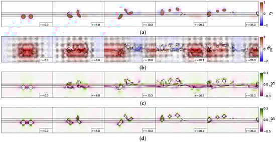 Merger of two anticyclones away from the slope for . (a) Upper layer relative vorticity (Equation (3)); (b) lower layer potential vorticity (Equation (2)); (c) lower layer velocity and “equivalent barotropic” potential vorticity (Equation (11)); (d) Jacobian term of layer coupling . In (a,b,d), the black contours indicate the topographic slope (Equation (12); straight lines) and the upper layer vorticity contours showing the two vortex evolution.
