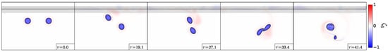 The advection of the passive tracer and of the particles injected in the flow has been studied for all the regimes analysed above (for both the cyclones and the anticyclones). We next illustrate this advection during the interaction of two cyclones for the regimes of merger and splitting shown in Figure 8.