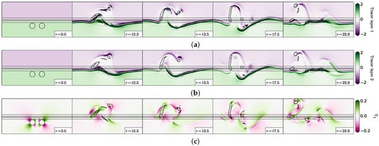 Tracer and strain evolution during the interaction of two cyclones for . (a) Tracer in the upper layer; (b) tracer in the lower layer; (c) strain field in the lower layer (Equation (6)). The black contours indicate the topographic slope (Equation (12); straight lines) and the upper layer vorticity contours showing the two cyclone evolution.