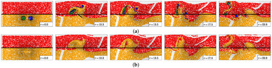 Particle evolution during the interaction of two cyclones for . (a) Particles in the upper layer; (b) particles in the lower layer. The black contours indicate the topographic slope (Equation (12); straight lines) and the upper layer vorticity contours showing the two cyclone evolution.