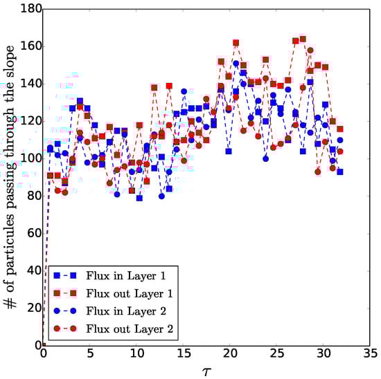 Number of particles crossing the slope inward and outward, in both layers, during the interaction of two cyclones for .