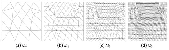 The test is carried out with the FreeFEM++ package [40]. The computational domain is the unit square . The kinematic viscosity is set equal to and the final time T is set equal to . An initial mesh is generated with five even nodes on the edges , 4 even nodes on and 6 even nodes on . Then, the edges are succesivelly halved to generate the computational meshes , see Figure 1. For the space discretization, we use Taylor–Hood finite elements. In our computation, we set the filter radius equal to the mesh size h, i.e., .