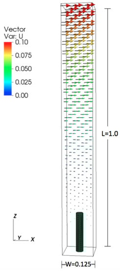 All numerical parameters are provided in Table 2. The height of the domain was set to 1.0, and the lengths in the x- and y-directions were set to , see Figure 1. The domain is periodic in the x- and y directions. The boundary conditions are set in the z-direction to model shear flow. The x-component of the velocity was set to 0.1 m/s at the top of the domain and to 0 at the bottom. The diameter of the cylinder was set to 0.03125 m, and the height was varied from 0.078 m to 0.625 m. Reynolds number () was varied by changing the dynamic viscosity.