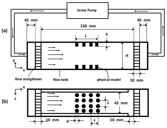 The models are inserted flush on the top and bottom walls of an optically accessible plexiglass flow tank with dimensions as shown in Figure 3. The fluid is driven by means of a screw pump that is powered by a DC (direct current) motor. To achieve parabolic inflow, the fluid entering and exiting the tank is passed through a set of flow straighteners consisting of a fine mesh. Note that, in the schematic in Figure 3, N is equal to 4 (as seen in the top view). This is merely for the purpose of illustration, as other variations of this parameter are examined as well (see Table 3 for details). The average inflow velocities with which the pump moves the fluid upstream of the models at the entrance is approximately = 0.0002 m/s. Using this value as the velocity scale for the fluid properties mentioned earlier, a value of approximately is achieved in these experiments, using the diameter = 0.001 m of the individual cylinders as the length scale, or using channel height H as the length scale. Since the pins used in the design of the models are opaque, the flow through the layer could not be resolved using particle image velocimetry (PIV) since this method requires optical access to acquire information.