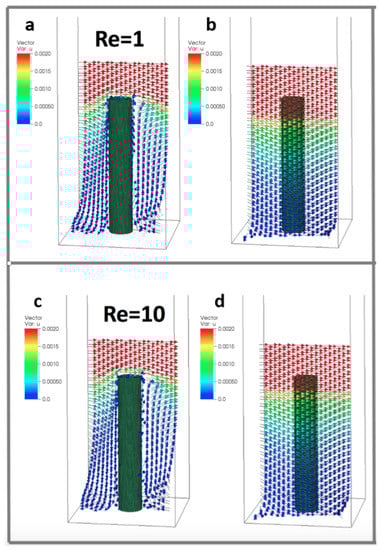 where is the viscosity of the fluid, is the dynamic viscosity of the fluid, U is a characteristic velocity (here defined as the free stream velocity), and L is a characteristic length scale. For the bulk flow , we use the height of the channel or computational domain as the characteristic length scale. To describe the relative importance of inertial and viscous effects at the level of the cylinders, we use a diameter based Reynolds number, , given by