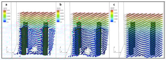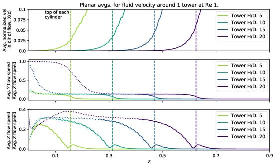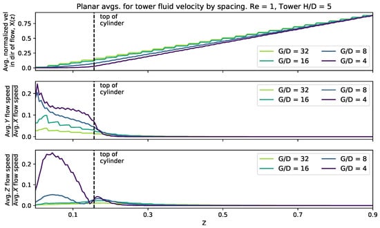We used several metrics to validate the three-dimensional simulations. Numerical simulations were performed for one cylinder with , = 5, and = 4 with and at the finest level. The average horizontal flow as a function of height agreed to within . The flow between two cylinders over a range of was calculated and compared to analytical results by [71]. Details of this study are reported in [5]. Finally, this implementation of the immersed boundary method has been checked against several standard fluid–structure interaction problems including flow past a sphere as reported in [72,73].