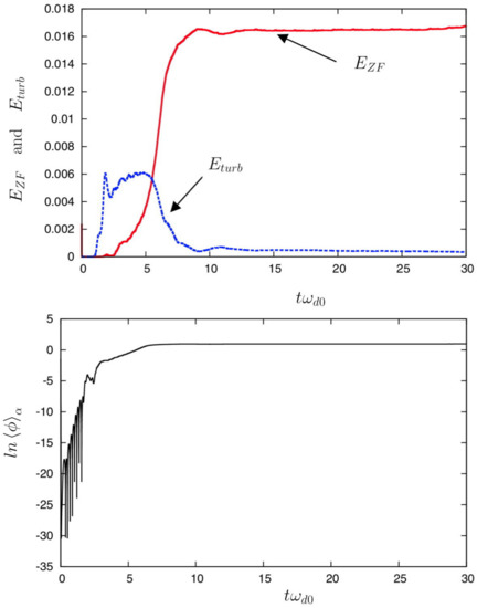 We choose to start with a small value of , i.e., well inside the Reynolds’ tensor-dominated regime. Results are presented, in the top panel of Figure 2, the time evolution of the zonal flow energy (in red and in solid line) together with its turbulent energy counterpart (in blue and in dotted line). As shown in Figure 2, the dynamics of the plasma are first governed by the growth of turbulence, as a result of the ITG instability. Here, it is the gradient in temperature that constitutes the energy source for the growth of TIMs, when the temperature gradient exceeds a critical value of . The case of an initial density gradient and of a resulting shear flow generated by a Kelvin–Helmholtz instability was presented in Ref. [37]. Here, the instability linked to a density gradient is not excited in the linear phase of ITG, but can appear later when nonlinear effects take place leading to the generation of shear flows. Note that at the saturation of ZF, in top panel in Figure 2, the turbulent component of the energy has strongly decreased. In the bottom panel in Figure 2, the corresponding evolution of the zonal flow component , taken at (in unit), is plotted in a logarithmic scale. Aside from the fast oscillation in the linear phase (linked to the linear TIM), no oscillatory behavior is observed in the saturation regime, a signature of the role played by the Reynolds tensor in the fluid regime.