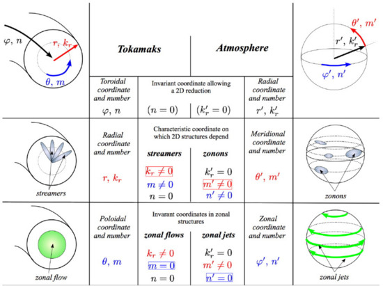 Basic mesoscale structures met in tokamak device (streamer and zonal flow) at left. The right side illustrates the corresponding mesoscale structures (zonons and zonal jets) found in the atmosphere. In the 2D description of drift-kinetic turbulence in a tokamak, the restriction to a planar geometry corresponds to the condition, which holds for both zonal flows and streamers. In the 2D description of zonostrophic turbulence, the restriction to a 2D geometry is given instead by the condition . The correspondence between the set of toroidal coordinates in drift-kinetic turbulence in tokamaks and the set of spherical coordinates in zonostrophic turbulence in the atmosphere is shown here.