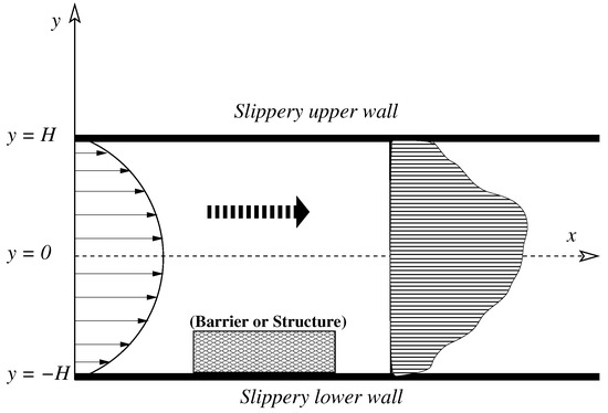The linear stability of a pressure-driven laminar two-dimensional asymmetric flow of a Newtonian, incompressible fluid in a horizontal channel with wall velocity slip is considered. The fluid has density and viscosity . Initially the flow might be symmetric with respect to the centerline of the channel, but later it becomes asymmetric. As shown in Figure 1, this can be possible because of the presence of some barrier/structures at a certain special position near the wall boundary inside the flow system or because of some cross-flow. The channel is long enough to neglect the initial and end effects. A Cartesian coordinate system is appointed for the flow system by taking the x- and y-axis along and perpendicular to the centerline of the channel . The walls of the channel are located at and are slippery or hydrophobic in nature.