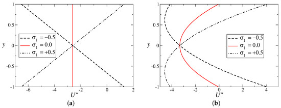 The characteristics of (the second derivative of velocity) are plotted in Figure 3 to check the inviscid instability of the flow using Rayleigh criteria [2]. As per Rayleigh’s theorem, if a wall-bounded flow is inviscidly unstable, then the mean velocity profile () must have an inflectional point inside its domain, that is, . Figure 3a,b is drawn for and , respectively. An inspection of Figure 3 reveals that the flow profile becomes inflectional for , which is in contrast to the symmetric flow considered by Lauga and Cossu [31]. The symmetric base flow used by Lauga and Cossu [31] is always inviscidly stable, but the asymmetric mean flow used in this study can be inviscidly unstable if . However, is always negative for both and when , indicating that the flow is inviscidly stable in this case.