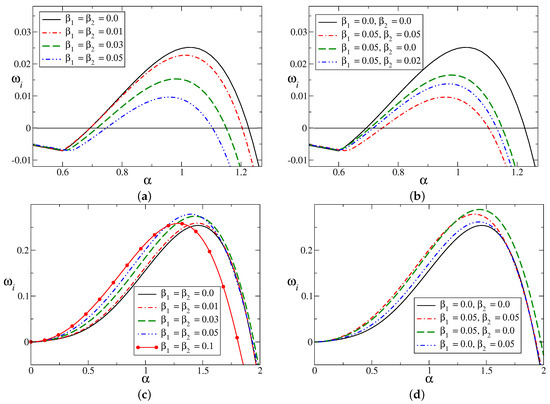 The effects of symmetric and non-symmetric slip on the growth rate of the asymmetric flow are investigated more neatly in Figure 5. The mean velocity profile contains only one non-zero model parameter () in Figure 5a–d, the values of the model parameters are and . In the absence of the skewness parameter (), both types of slip stabilize the flow by reducing the growth rate of the disturbances with respect to time for all wave numbers. However, in the presence of back-flow (for ; see Figure 2) near the wall, velocity slip promotes the growth of disturbance as compared to the no-slip case for the considered value of the Reynolds number (; Figure 5c,d). Figure 5d shows that the growth rate is maximum when the system has velocity slip only on the upper wall ().