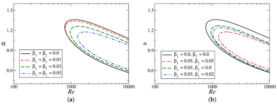 Next, we move to the flow configuration for which both the model parameters are non-zero. Figure 8 displays stability boundaries in the floor. The asymmetric channel flow is unstable at very low Reynolds numbers (critical Reynolds number is of ) for the parameter values and (Figure 8a,b), and (Figure 8c,d). There is no qualitative change in the stability curves as a result of the sign change of (skewness changing parameter). Additionally, symmetric slip has a minor effect in this parameter range. However, asymmetric-type slip plays a very interesting role depending on the value of (Figure 8b,d). Asymmetric-type wall velocity slip can destabilize the flow by decreasing the critical Reynolds number (see Figure 8b with and Figure 8d with ). Most importantly, the presence of slip only on the upper wall stabilizes the flow system when (>0; Figure 8b) and it destabilizes the flow when (<0; Figure 8d). The reverse statement is true for the flow configuration with velocity slip only on the lower wall. We note that the symmetry and skewness of the velocity profile are completely dependent on the absolute value as well as on the sign of the parameter .