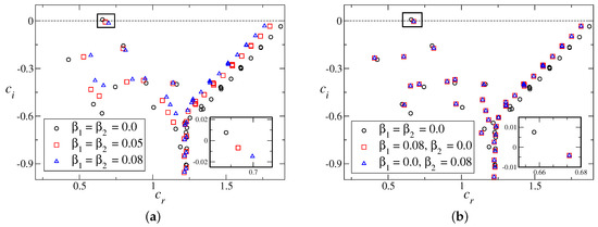 Eigenspectra for , and : (a) with symmetric slip (); and (b) with non-symmetric slip ().