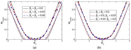 Maximum growth rate () as a function of for and : (a) with symmetric slip (); and (b) with non-symmetric slip (). Curves with symbols are for .