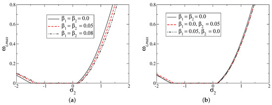 Maximum growth rate () as a function of for : (a) symmetric slip () and (b) non-symmetric slip ().