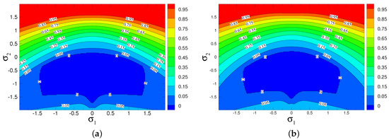 Contours of maximum growth rate for : (a) symmetric slip (); and (b) non-symmetric slip ().