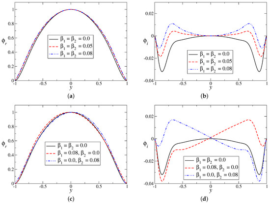 The sample set of eigenfunctions for the most unstable eigenmode are shown in Figure 12. It is notable that the presence of wall velocity slip has disturbed the look of the typical eigenfunctions. The real () and imaginary () part of stream functions are presented in Figure 12a,c and in Figure 12b,d, respectively, for symmetric and asymmetric slip conditions. Although is weakly dependent on slip parameters, the wall velocity slips destroy the symmetry of for the case of asymmetric slip (Figure 12d). This may provide some mechanism in terms of energy disturbance between the mean and perturbed flow, for the dynamics of the flow instabilities.