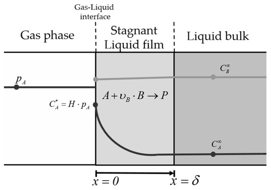 The numerical method is based on a Two-Film model [18]. In this model, reactant A is in the gas phase and reactant B is in the liquid as shown in Figure 2. When gas-side mass transfer is neglected, the concentration of A on the interface is determined by the partial pressure of A in the gas and by Henry’s solubility constant (H). Component A diffuses through the film of thickness δ into the bulk while simultaneously reacting with B, which diffuses in the opposite direction.