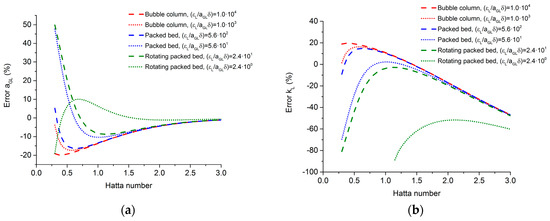 Percentage error in estimation of (a) interfacial area (aGL) and (b) mass-transfer coefficient (kL) using the Danckwerts’ plot in the intermediate reaction regime for the different equipment.