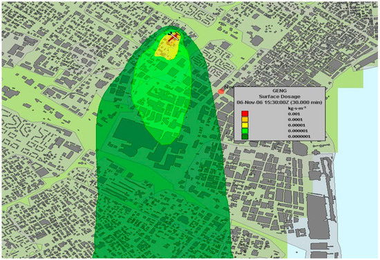 The urban element is based on the analytical model developed by Franzese and Huq [52]. The model is based on a standard Gaussian formulation, in which the mean concentration c is predicted by Equation (1), in which y indicates the crosswind direction, z the vertical direction, and are the standard deviations of the crosswind and vertical distributions of concentration, respectively and is the reference wind speed and Q the mass release rate.