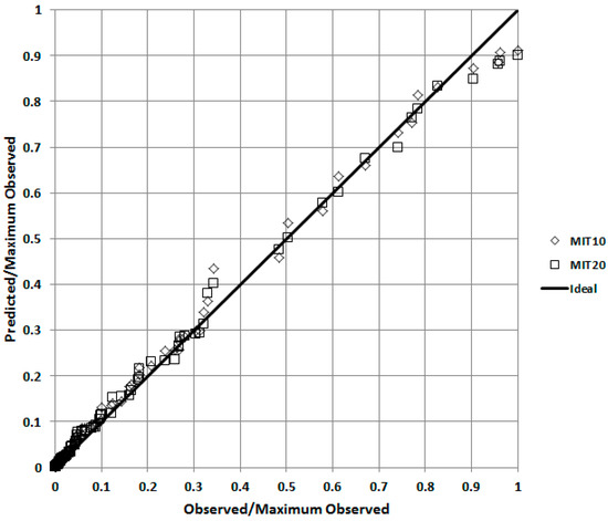Quantile–quantile plot comparing predictions from UDM against observed concentrations for release 49 of Prairie Grass, for two different meteorological inputs MIT10 and MIT20.