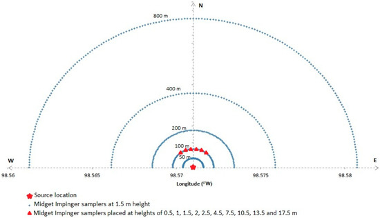 Probably the best known, and most analysed field dispersion dataset is that from the Project Prairie Grass (Haugen and Barad, [40]). In this experiment 600 samplers were deployed over a flat area of prairie in semi-circular arcs from 50–800 m to ensure that the plume was captured, as shown in Figure 6. This meant, however, that the number of samplers that recorded data (single concentration averages) was limited to a small fraction of the total number, so limiting the lateral definition of the plume; even so, the edges of a small number of releases were not fully captured. It can be seen from Figure 6 that the vast majority of samplers were at a height of 1.5 m, and that detailed vertical sampling at 10 heights was limited to a narrow sector of the 100 m arc close to the source. This is a limitation of most field experiments, in that although dispersion is a three-dimensional process, the sampler data is largely restricted to a single horizontal plane close to ground level, with only small numbers of measurements in the vertical dimension.