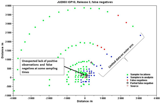 Comparison of UDM prediction with observed sampler data for IOP 10, release 3 of JU 2003. Partial false negatives refer to locations at which the model did not predict positive concentrations at all the time intervals they were recorded at. Adapted from Herring, S. and Huq, P., 2016, 17th International Conference on Harmonisation within Atmospheric Dispersion Modelling for Regulatory Purposes [7].