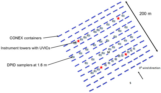 Figure 8 shows the layout of the mock urban setting test (MUST) [43,44]. In this experiment 120 CONEX containers were arranged in a regular grid over a 200 m square area, giving an array footprint area density of 8% (contrast this with the high density of buildings in central London shown in Figure 2). The sampling instrumentation consisted of 74 high frequency samplers. A total of 37 different release locations were used and 68 releases made with durations varying from 4 to 22 min. This multiplicity of variations makes identification of systematic errors between observed and predicted values difficult, although it is mitigated to a degree by the fact that the releases were made in the early morning and evening, which meant that the stability conditions were generally stable.