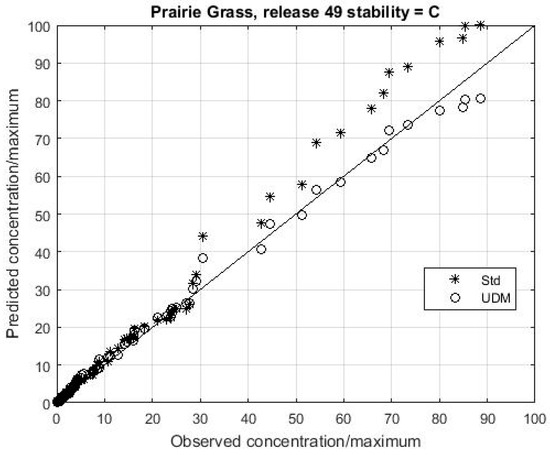 As a proof-of-concept an analytical Gaussian plume model for continuous ground level releases is taken which is applicable to open terrain and urban areas. The open terrain element of the proposed model is based on the work of Panofsky et al. [49] and Caughey et al. [50,51]. Figure 9 shows a QQ plot for Prairie Grass release 49 for the analytical model and compared to that from UDM (as shown in Figure 4). For this particular release, the plot shows that the analytical model provides similar predictions to UDM far away, but suggests that the more sophisticated relationships used in UDM (Similar to those used in the widely used US Environmental Protection Agency AERMOD code [36].) may provide better predictions close to the source.
