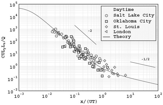 The comparisons conducted by Franzese and Huq [52] against data from urban experiments conducted in Oklahoma City, Salt Lake City, London, and St. Louis showed that the model predicted the existence of near and far field urban dispersion regimes. Their analysis showed that the dispersion process transitioned from a near-field regime to a far field regime at around where is the downwind location, the mean wind speed at rooftop level and the square root of the product of the horizontal and vertical turbulence timescales. In addition, the results were consistent with the power law of the form , where is the maximum mean ground level concentration. This relationship has frequently been observed in urban experiments, and suggests that comparisons with field data may be undertaken using regressions of the form:
