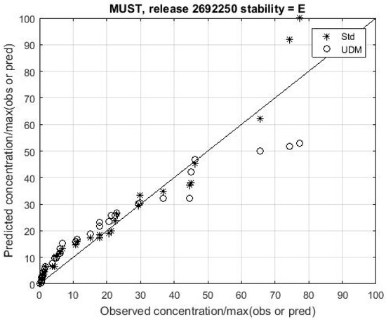 Figure 12 shows a QQ plot comparison of observations and predictions for UDM and the proposed reference model for a release in the MUST experiment. The model outputs are again quite similar except close to the source.