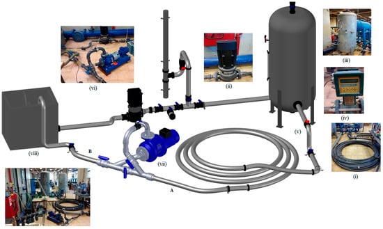 The hydraulic facility is composed of several components: (i) A loop high density polyethylene pipe (Figure 1); (ii) a pump that feeds the loop pipe system; (iii) a compressed air vessel to stabilize the pipe system pressure; (iv) an electromagnetic flow meter to measure the instant flow; (v) flow control valves along the pipe; (vi) pressure transducers, to register the pressure variations and a picoscope data acquisition system connected to a laptop; (vii) a centrifugal micro PAT; (viii) a free surface reservoir, with a 90° triangular weir to calibrate the discharge flow. The nominal external diameter (DN) is 50 mm with 100 m of length. The pressure inside the air vessel can oscillate between 20 and 35 mWc (meters of water column).