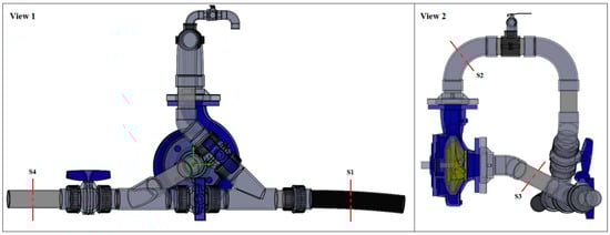 Several tests were carried out for different flow values and consequently different rotational speeds. Some tests are presented in Table 2 sorted by the rotational speed values. For each flow rate the rotational speed of the PAT was measured by means of a digital tachometer. The pressure values were recorded as previously described, and the velocity profiles were collected in different PAT sections (S1–S4) using a 3000 series ultrasonic doppler velocimetry (UDV). This equipment allows the registration of velocity profiles, in real-time, either in steady or unsteady state conditions. This device is able to perform instantaneous measurements of fluid velocities at a number of points, along the direction of emission of the ultrasonic signal, with remarkably high resolutions in space and time. It is an interesting tool for turbulent flow analysis, where high spatial and temporal accuracies are required for both instantaneous measurements and averaging operations. In each UDV measurement, the velocity was captured in 100 different points in a total of 100 profiles. Details of the points (S1–S4) where the measurements took place are identified in Figure 2.