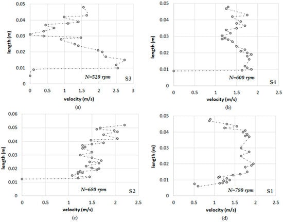 Velocity profiles (m/s) obtained in experimental tests and CFD simulations: (a) N = 520 rpm; (b) N = 600 rpm; (c) N = 680 rpm; (d) N = 780 rpm.