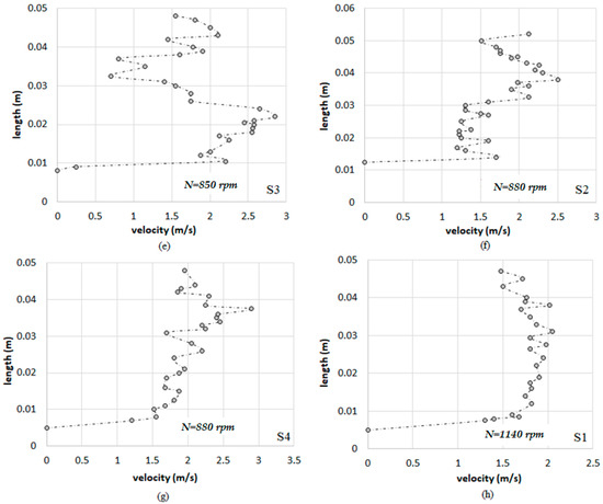 In Figure 3b,g, the measuring point S4 is already located out of the draft tube, so it is expected that in this section the vorticity and flow turbulence will decrease returning again to an approximate uniform flow type. The differential of velocities between the axis and the pipe wall in S4 is lower than in S3. The non-uniformity in the velocity distribution showed in Figure 3b,g results from the vorticity that still attain S4, which also result from 45° junction of flow changed direction located immediately upstream (Figure 2).