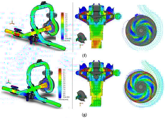 In Figure 5, the velocity streamlines distribution confirms the rotation of the flow along the draft tube, and the distribution of the tangential velocity shows increasing values from the axis to the wall surface of the pipe. The reduced flow velocity values that occurred in the vortex core (located near the axis of the pipe) that is formed downstream of the rotor, and the marked velocity that reaches the wall of the draft tube due to the rotationally of the flow, are more visible in Figure 5d,f,g. The rotational behavior, affected by the rotational speed of the impeller and the shape of the blades is also verified. A decrease of the tangential velocity values from the periphery to the shaft of the runner confirming the centrifugal force effect is shown which arises with the rotor rotation increase. The flow enters the volute and exerts a radial force on the rotor, thereby imparting a certain rotational speed to the impeller. Consequently, the runner rotation continuously varying the direction of flow along the impeller, becomes to axial direction at the exit.