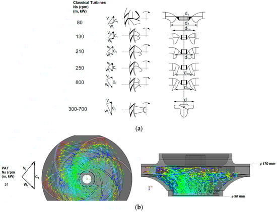 Velocity components: (a) Classical turbines inlet triangle of velocities for different Ns (m, kW) adapted from [26]; (b) radial PAT flow impeller for Ns = 51 rpm (m, kW), in front and cross section view. Reproduced with permission from [26].