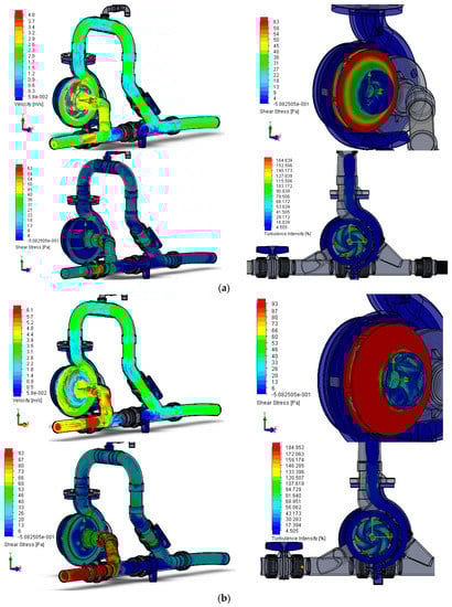 Values of velocity, shear stress and turbulence in several parts of the PAT: (a) N = 810 rpm and Q = 2.9 L/s; (b) N = 1500 rpm and Q = 4.6 L/s.