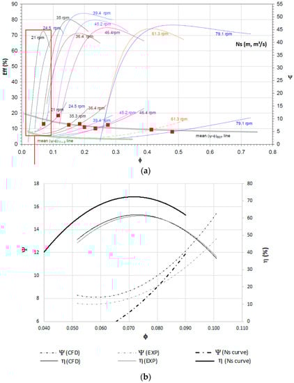 Therefore, is a characteristic parameter [19] concerning the turbine type, the runner shape and its associated dynamic behavior. According to [17,18] and [23,29] the performance characteristics of 9 PATs with different specific speeds (Ns) were considered (Figure 12a), namely for different specific speeds (i.e., 21 rpm, 24.5 rpm, 35 rpm, 36.4 rpm, 39.4 rpm, 45.2 rpm, 46.4 rpm, 61.3 rpm and 79.1 rpm).