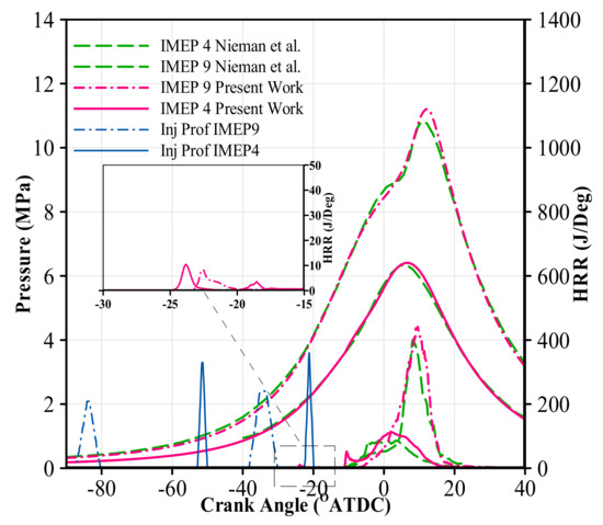 | Nieman et al. [17], IMEP 9 bar | 50.4 | 1.2 | 0.02 | 0.003 | 2.5 | 1.8 |
