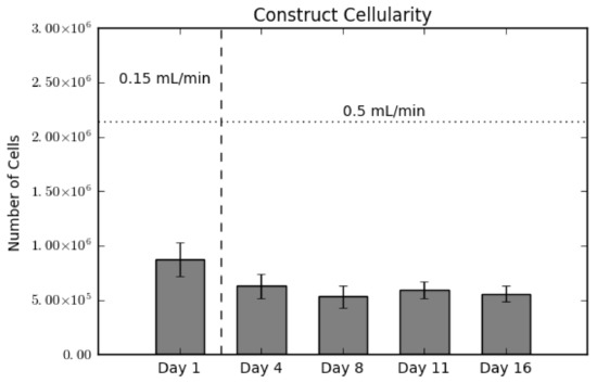 Construct cellularity for each construct over the culture period. The horizontal dashed line indicates the initial amount of cells seeded. The vertical dotted line indicates the switch in flow rates, from 0.15 mL/min during seeding to 0.5 mL/min for culture. Values are given as the mean ± the standard error of the mean (n = 4).