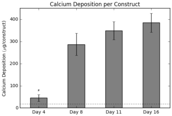 Calcium levels present within each construct over the culture period. The horizontal dotted line represents the background signal for an empty construct. Values are given as the mean ± the standard error of the mean (n = 4). The # signifies the significantly lowest value ( 0.01).