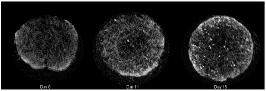 Summary of mineralized tissue (hard extracellular matrix (ECM)) deposited in cultured constructs rendered during microcomputed tomography (CT) with Simple Viewer for samples taken on Days 8, 11 and 16, respectively.