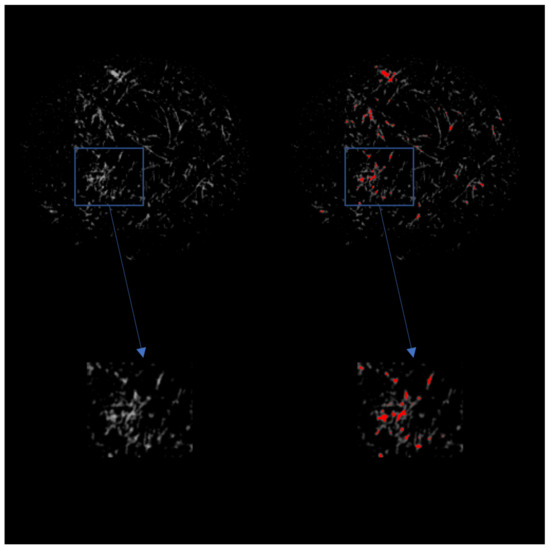 (Left) 2D grayscale view of the scaffold after CT imaging. The top row is a view of the entire scaffold, while the bottom row is a magnified view of the indicated area of interest. (Right) 2D view of the scaffold after CT imaging with ECM indicated in red.