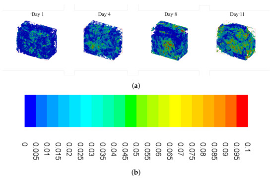 Summary of wall shear stress heat maps for constructs cultured under osteoconductive conditions. (a) Wall shear heat maps for Day 1 (far left) to Day 11 (far right) obtained using the custom lattice Boltzmann method code. (b) Scale bar: values given in .
